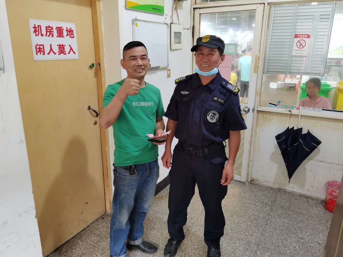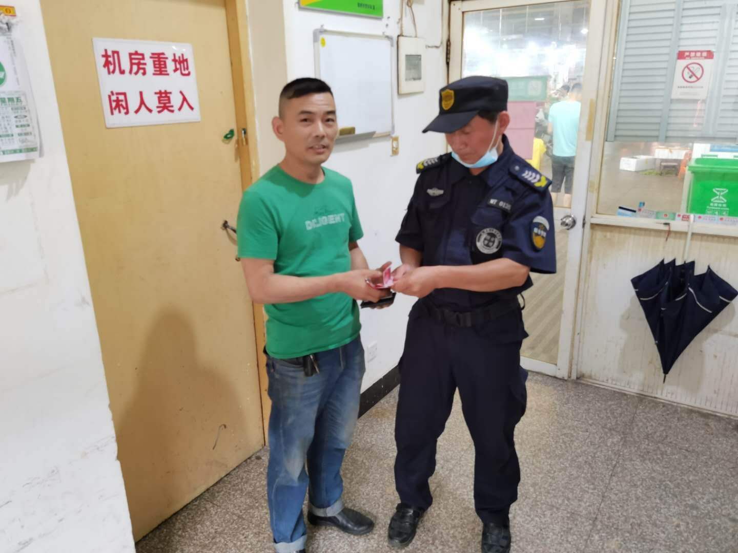 6月25日15:00,該項(xiàng)目隊(duì)員沈東林在星橋農(nóng)貿(mào)菜場巡邏時,撿到500元現(xiàn)金,詢問周邊商戶和行人無果后,小沈就將情況上報(bào)給當(dāng)班負(fù)責(zé)人付串串。付串串立即查看監(jiān)控,發(fā)現(xiàn)是一名中年男子掉的錢。