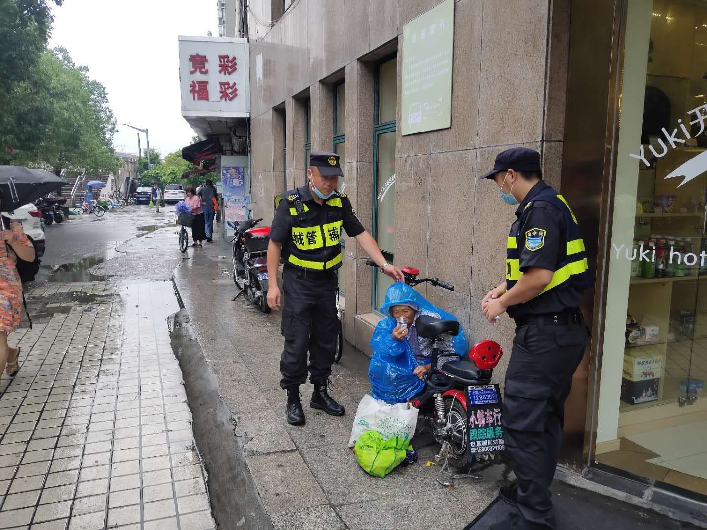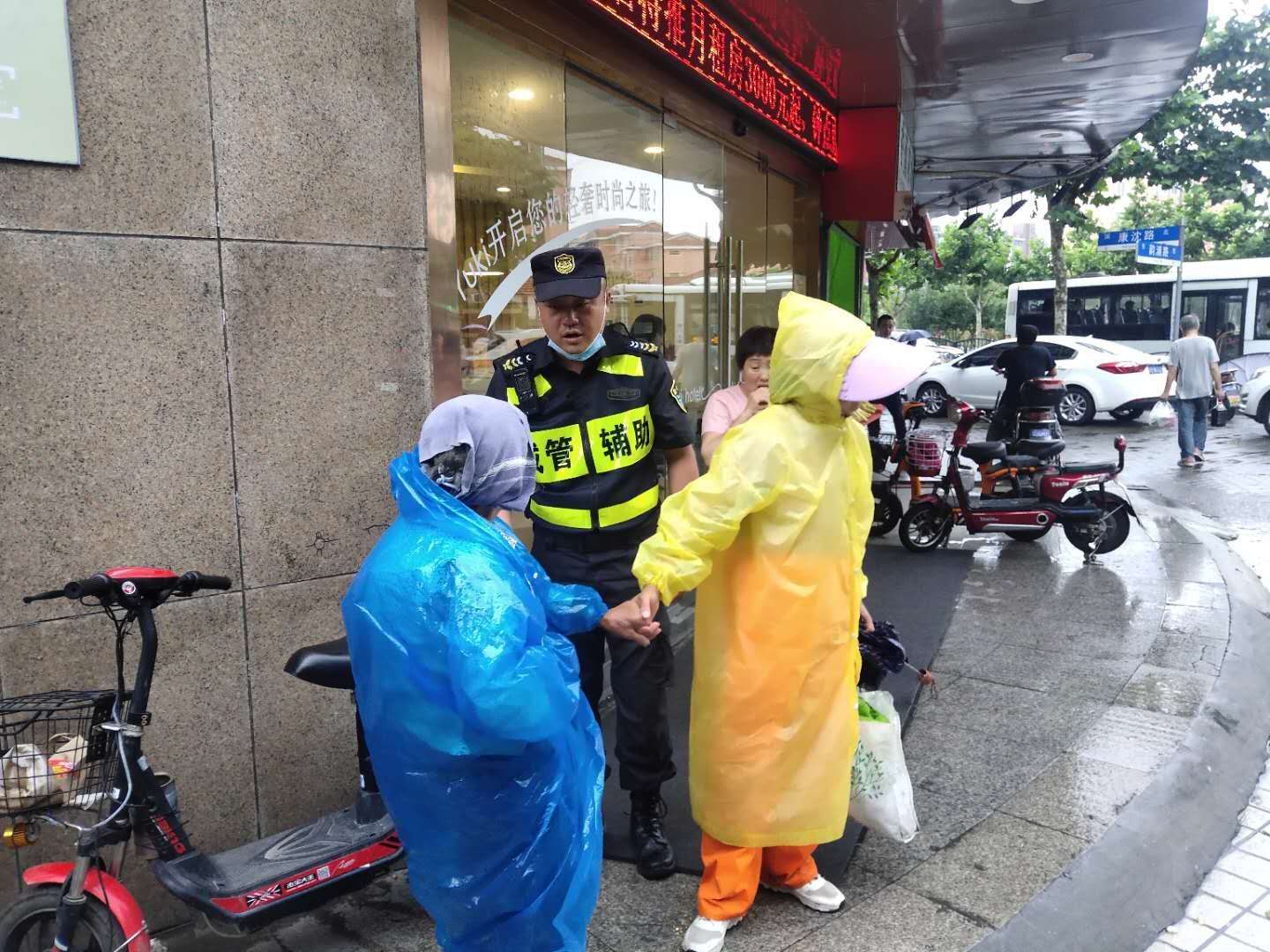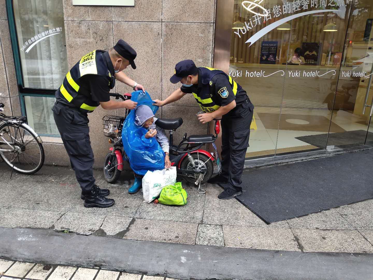 6月29日,宗保公司駐周浦市容項(xiàng)目三組隊(duì)員王明明,巡邏至湯家木橋西側(cè)時(shí),看到一位老人瑟瑟發(fā)抖,蜷縮在勇丞酒店外墻邊。剛下過(guò)一場(chǎng)雨,老人沒(méi)帶任何雨具,只帶著頭巾,衣服幾乎濕透。這里離菜場(chǎng)很近,過(guò)往的人行色匆匆,沒(méi)有人多看老人一眼。