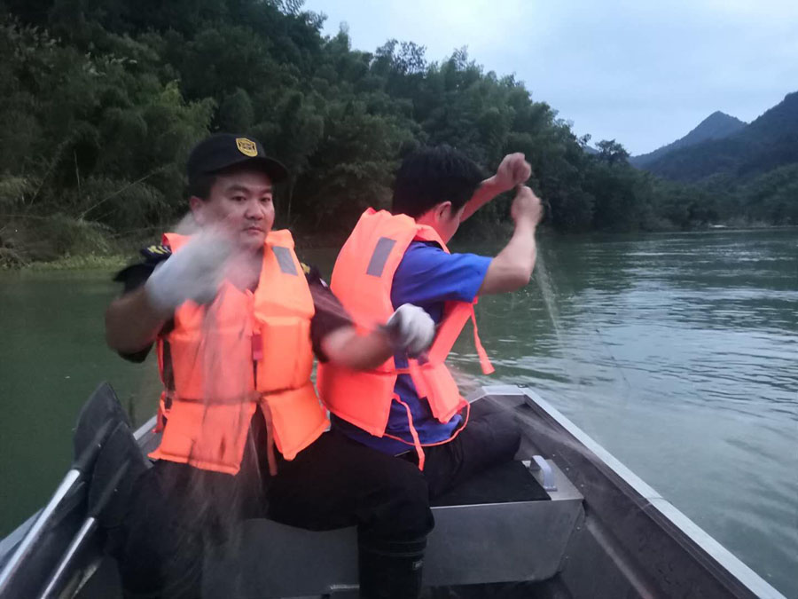 汛期洪水過后,齊云山轄區(qū)橫江流域水位迅速下降,附近漁民趁機下網(wǎng)布籠進行非法捕撈。為保護橫江生態(tài)環(huán)境,在齊云山景區(qū)管委會的組織和帶領(lǐng)下,宗保隊員于7月14日18:00和15日凌晨3:00兩次出擊,在齊云山轄區(qū)橫江水域協(xié)助執(zhí)法部門打撈并收繳地籠20多副、魚網(wǎng)30多副。