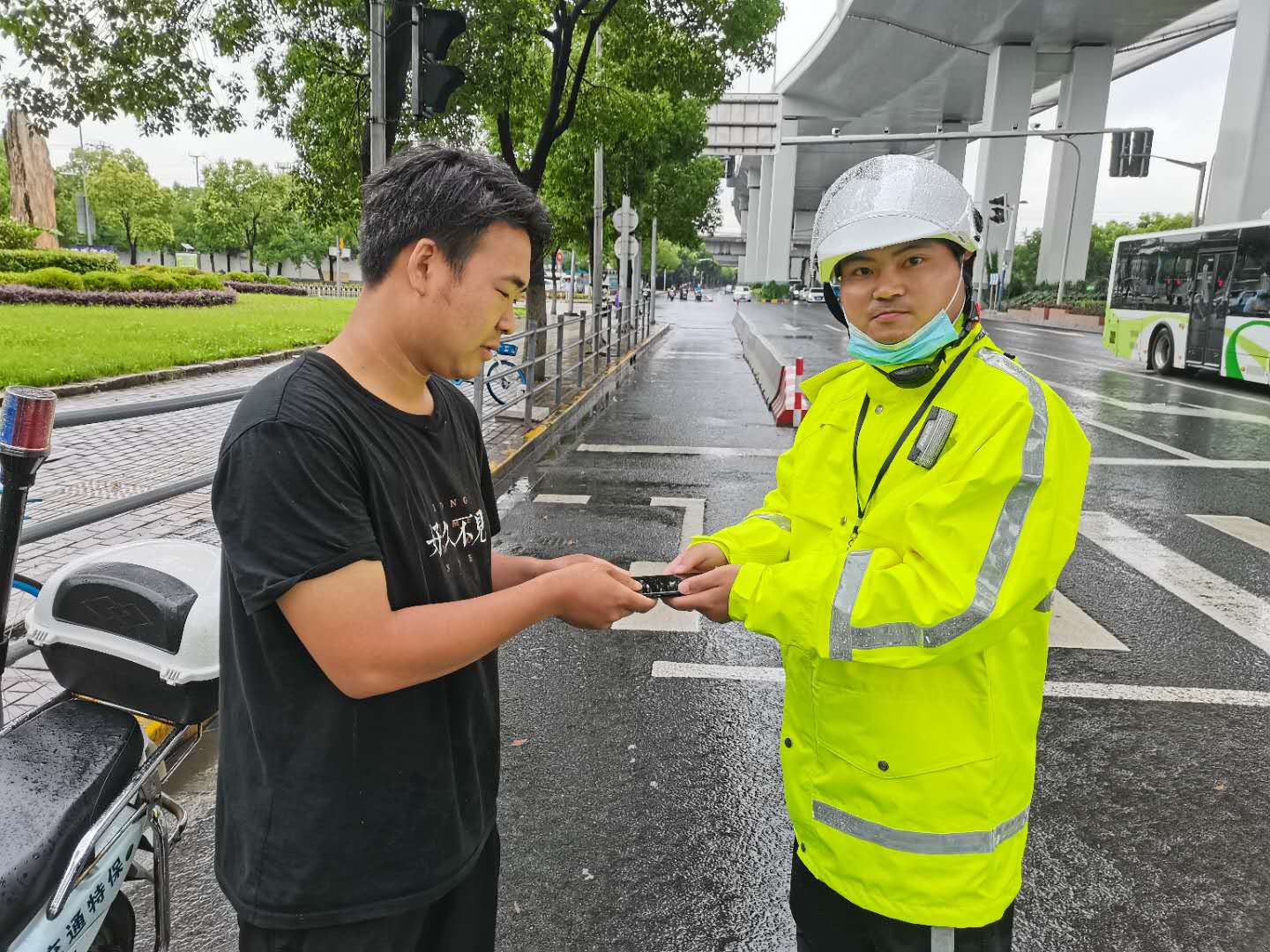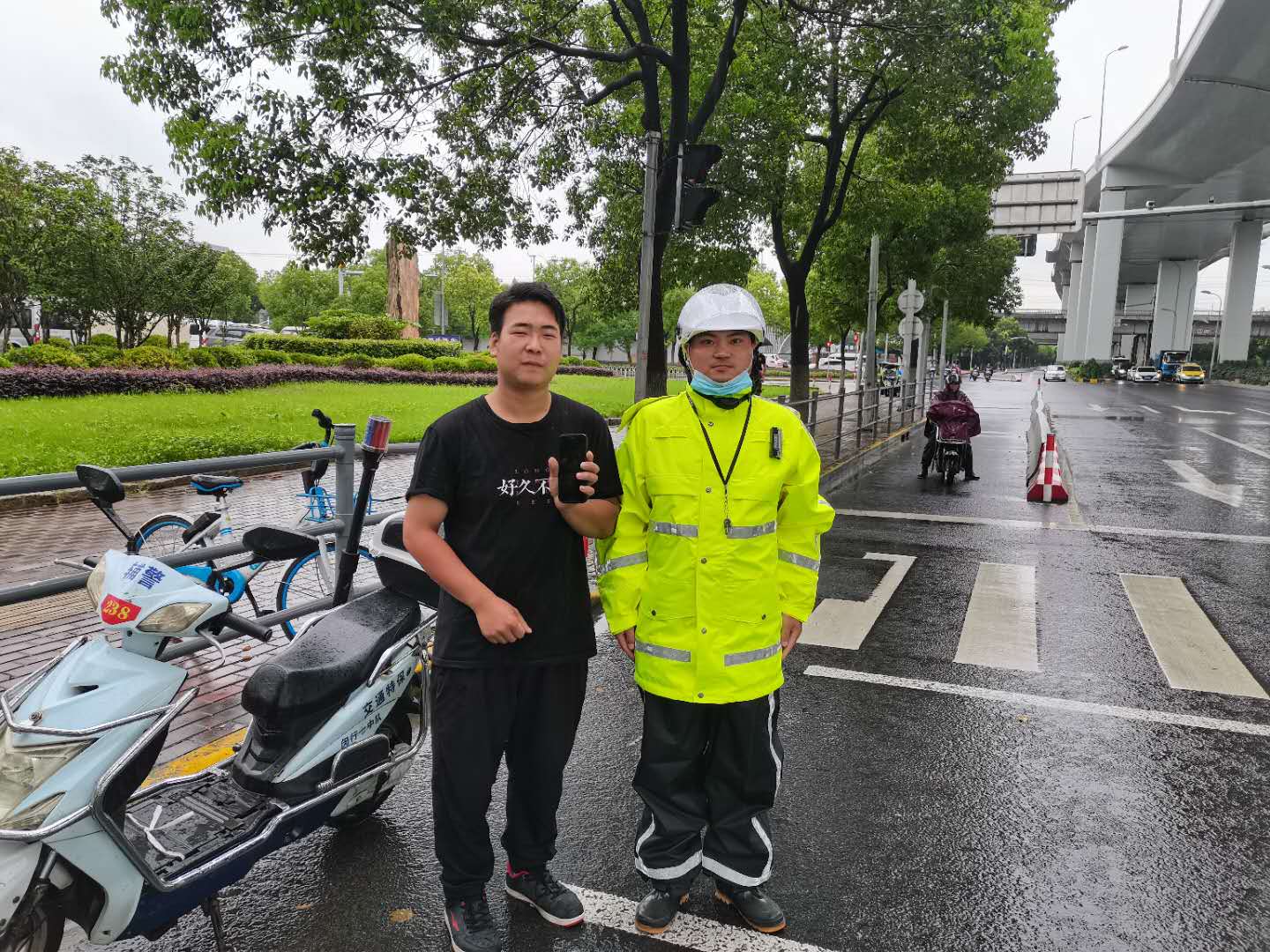蔣虎第一時(shí)間將情況上報(bào)項(xiàng)目負(fù)責(zé)人,考慮到失主可能沒(méi)有走遠(yuǎn),得到指令后在原地等待。10分鐘后,失主打來(lái)電話,蔣虎和失主約好見(jiàn)面地點(diǎn)。沒(méi)過(guò)多久,一位身穿黑色T恤的男士急匆匆地跑過(guò)來(lái),經(jīng)核實(shí)確認(rèn)身份后,蔣虎將手機(jī)交還失主。失主當(dāng)場(chǎng)對(duì)小蔣表示感謝,并主動(dòng)要求合影。