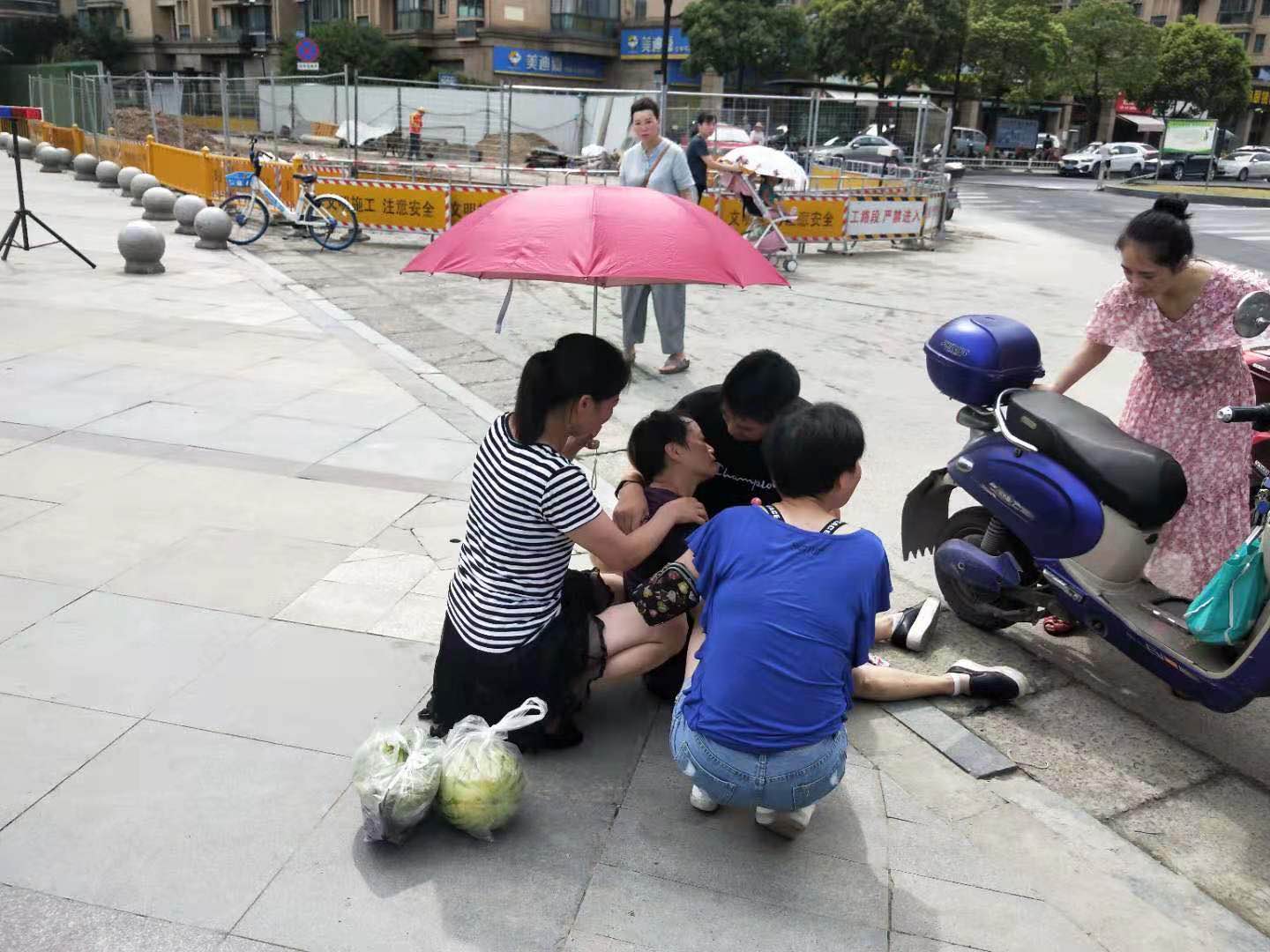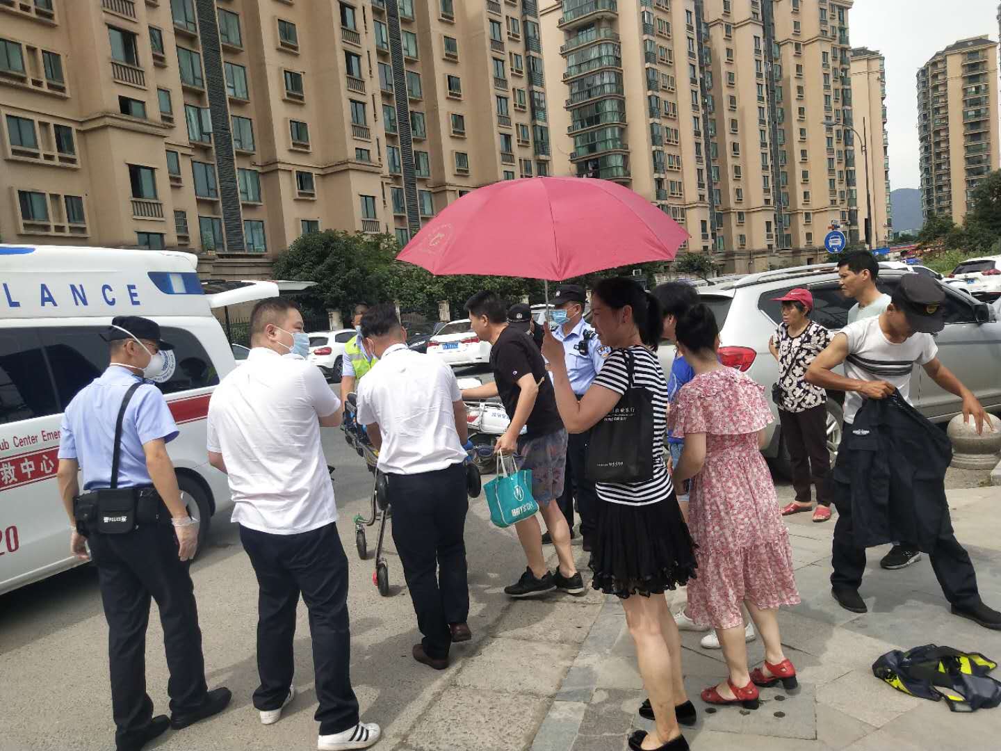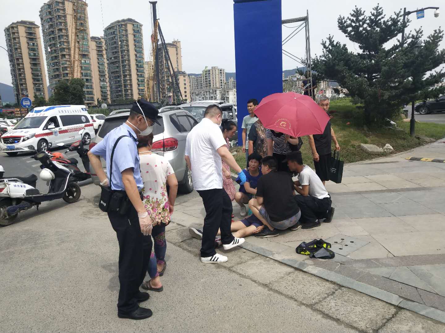 向榮立刻撥打120急救電話,同時脫下自己的外套墊在地上,讓暈倒女子平躺在地,掐她的人中并跟她保持交流,這時圍觀的市民也紛紛幫忙撐傘遮陽。
