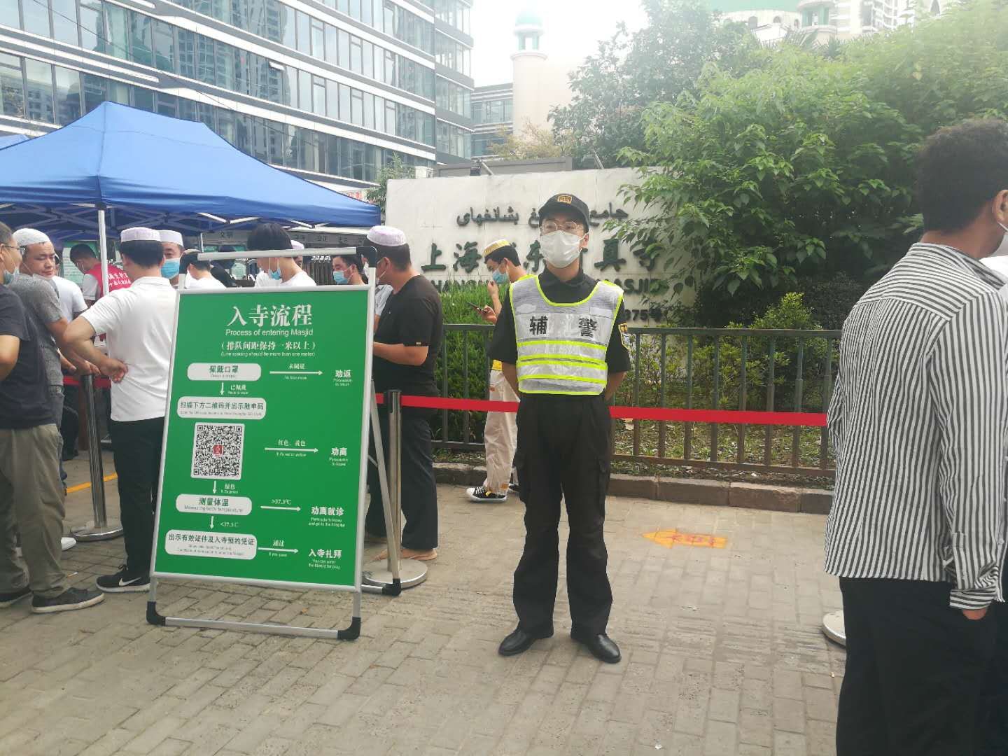 自新冠肺炎疫情暴發(fā)以來,浦東清真寺一直處于封閉狀態(tài)。7月31日,迎來了伊斯蘭教重大節(jié)日—古爾邦節(jié)。此次是浦東第一個宗教場所恢復開放,街道和派出所領導高度重視。宗保公司駐洋涇輔警項目接到任務后,選派10名精干隊員,配合民警維護節(jié)日現(xiàn)場秩序,嚴格控制人流密度,設立告示牌、一米線等標示。