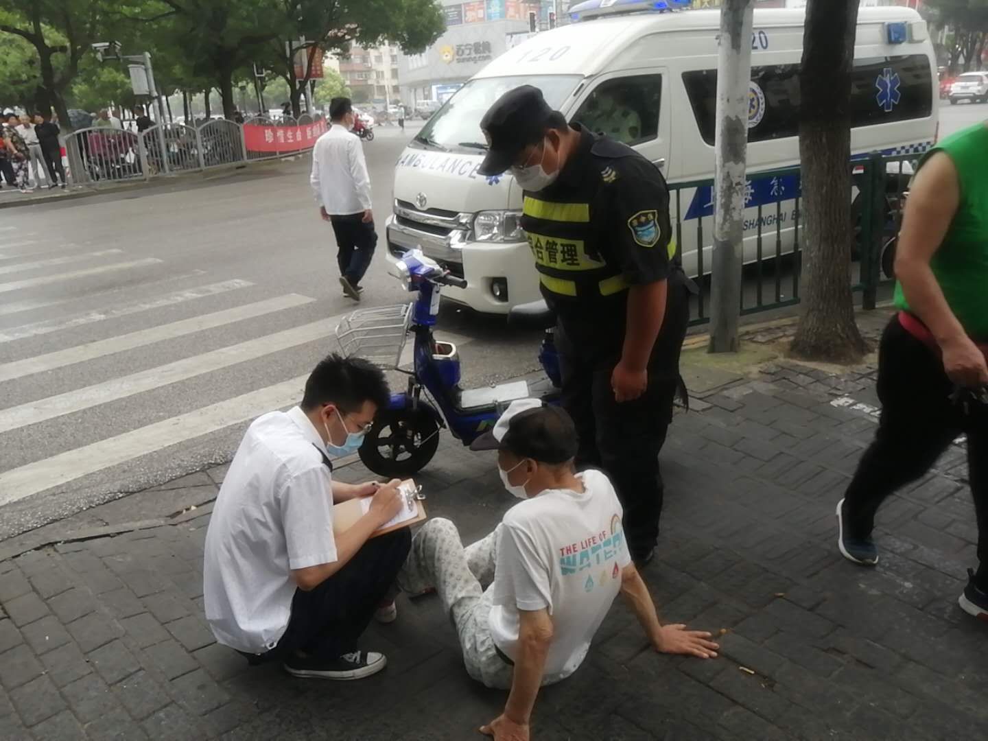當(dāng)天15:40左右,鄭世豪和陳睿巡邏到張楊北路清溪路交叉口時(shí),看到一位老人坐在地上,一輛電瓶車(chē)倒在一旁。見(jiàn)此情景,鄭世豪和陳睿急忙跑向前,詢(xún)問(wèn)老人受傷情況。老大爺說(shuō)自己騎電瓶車(chē)避讓行人不小心摔倒了,腿上、胳膊上擦破點(diǎn)皮不要緊,就是覺(jué)得有點(diǎn)頭疼,感覺(jué)腦子有點(diǎn)迷糊。