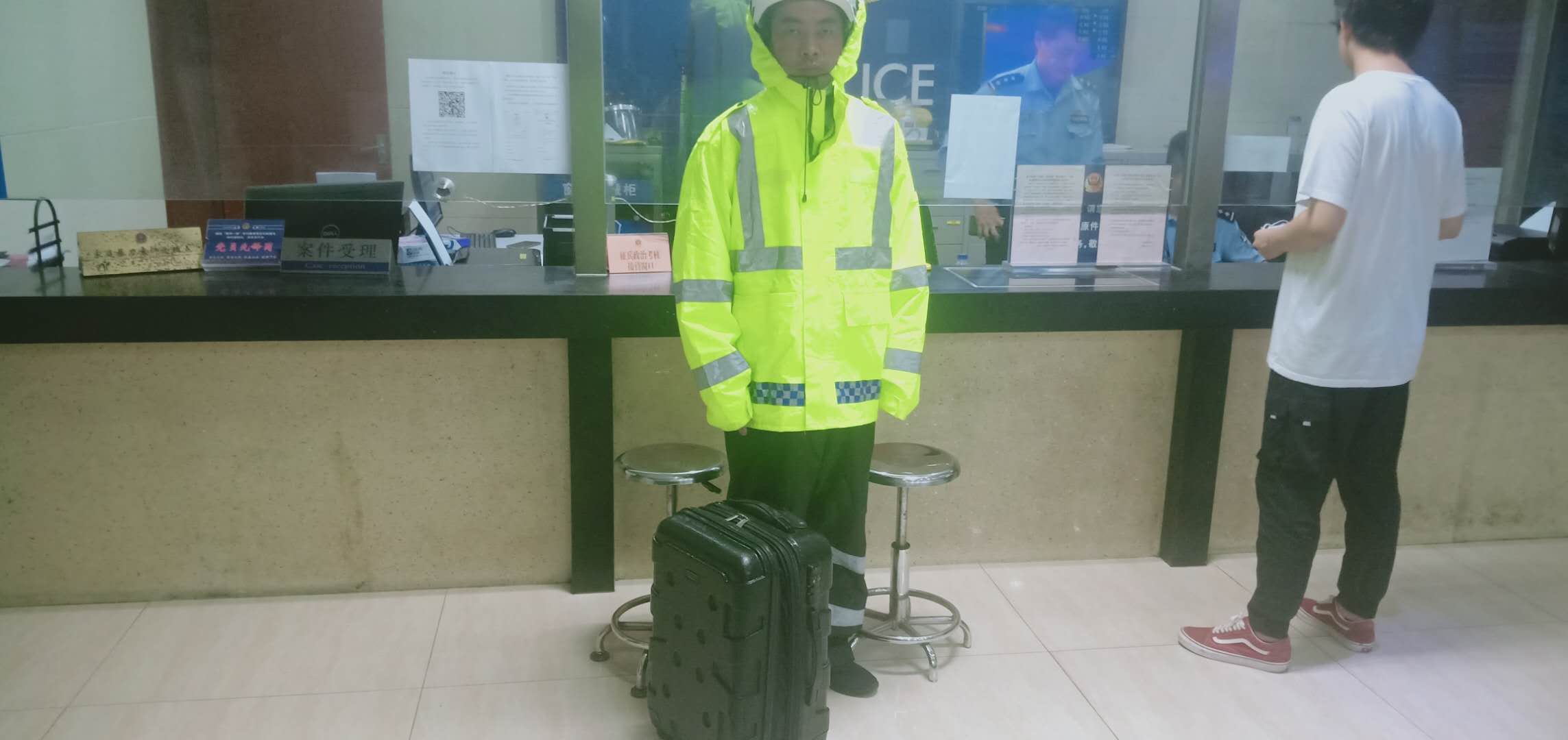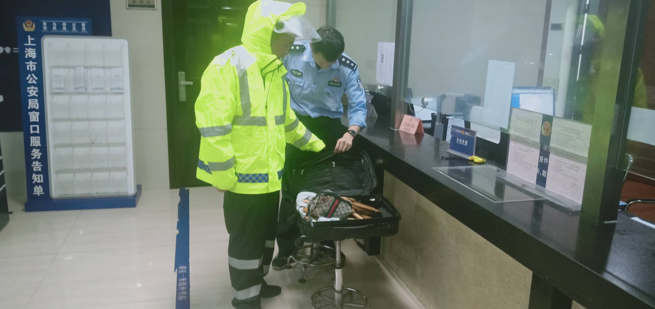 當(dāng)日17:17,宗保公司駐閔行虹橋交通輔警唐信江在龍柏地鐵站5號口執(zhí)勤時,發(fā)現(xiàn)有一個黑色行李箱,無人認(rèn)領(lǐng)。考慮到丟失箱子人的焦急心情,唐信江就在地鐵站口一邊執(zhí)勤一邊等待失主,但直到下班也沒有等到有人前來認(rèn)領(lǐng)。于是,唐信江將行李箱送到虹橋派出所,交給了當(dāng)班民警處理。