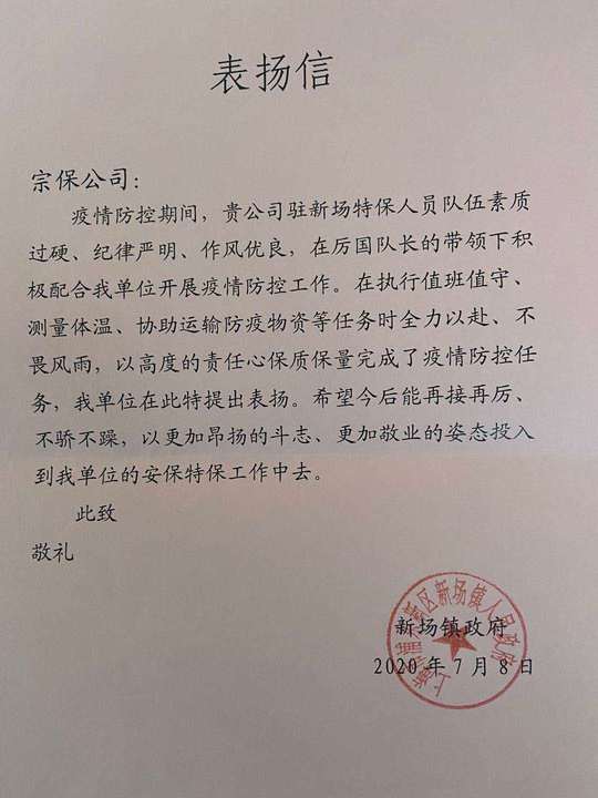 近日,公司收到了一封來自新場鎮(zhèn)政府的表揚信,信中對厲國隊長及特保人員高度認可,高質(zhì)量配合好疫情防控工作表示感謝與贊揚,保障了疫情期間的安全穩(wěn)定,給公司予以表揚和鼓勵。