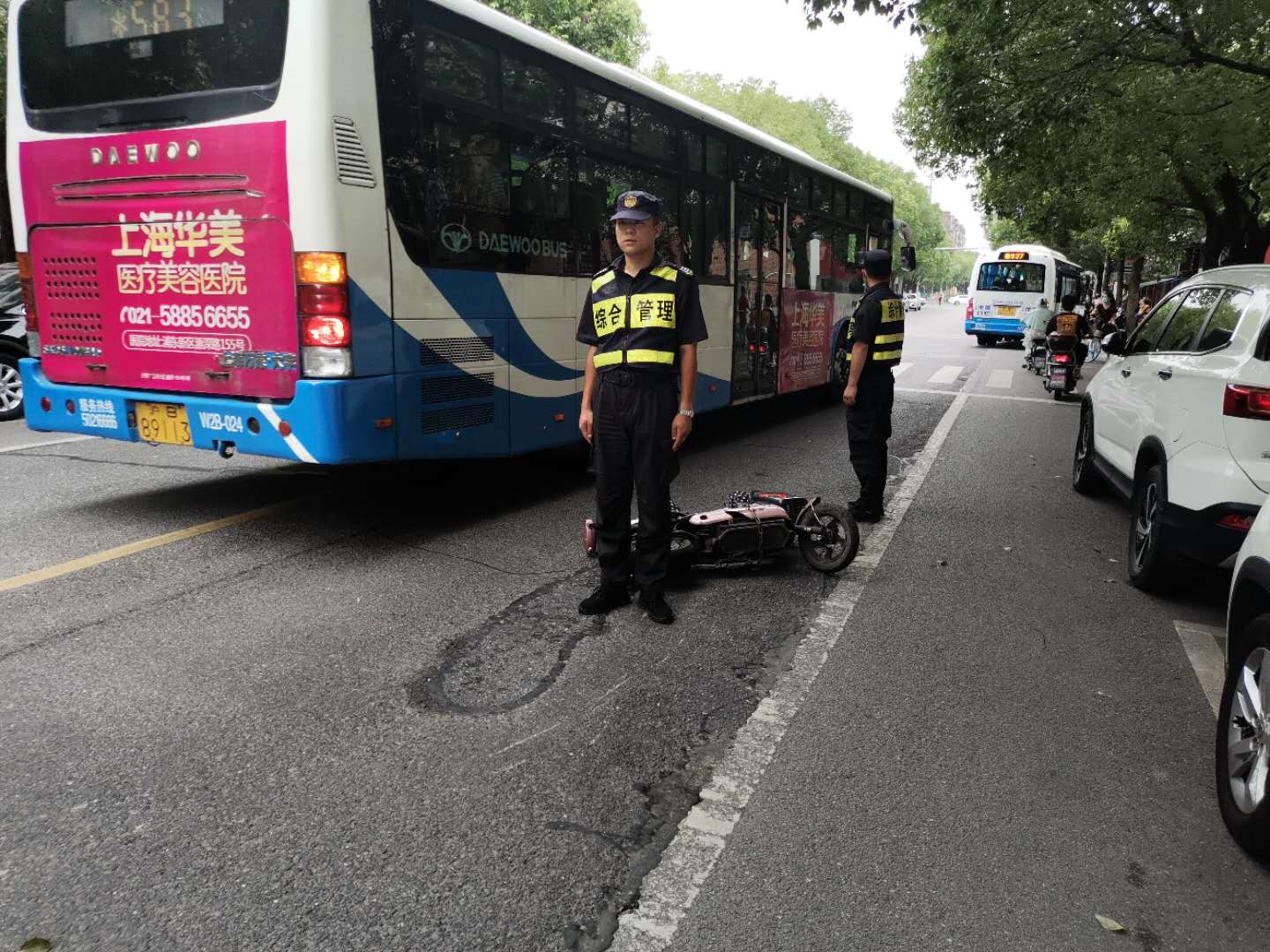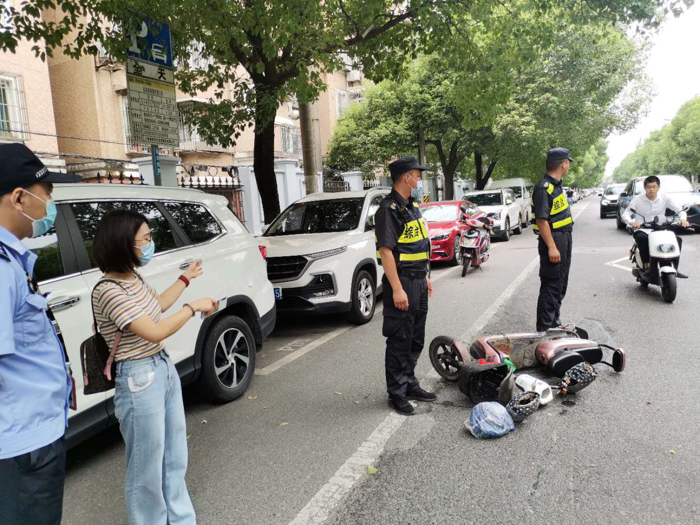 “快,那邊有個人撞車了,快去救人”,8月10日9:30左右,正在巡邏的李子敬、李斌大聲呼叫著。原來是一名騎車的女子在板泉路桃李家園門口發(fā)生了交通意外。