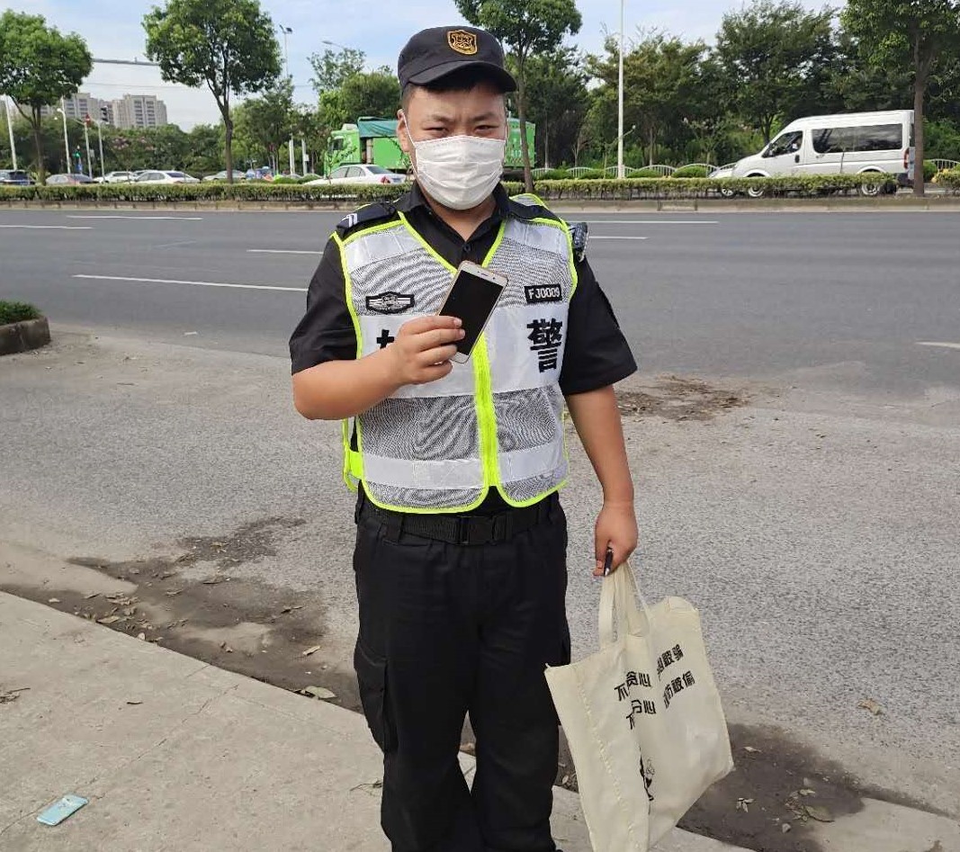 8月7日7時左右,周浦市容輔警項目隊員馬跨越、呂振濤在申江南路周祝公路配合民警進行交通整治時,撿到一部沒有設(shè)密碼嶄新的華為手機,第一時間匯報項目。