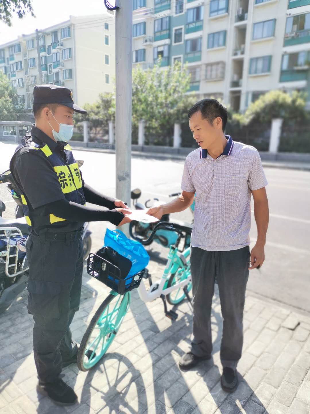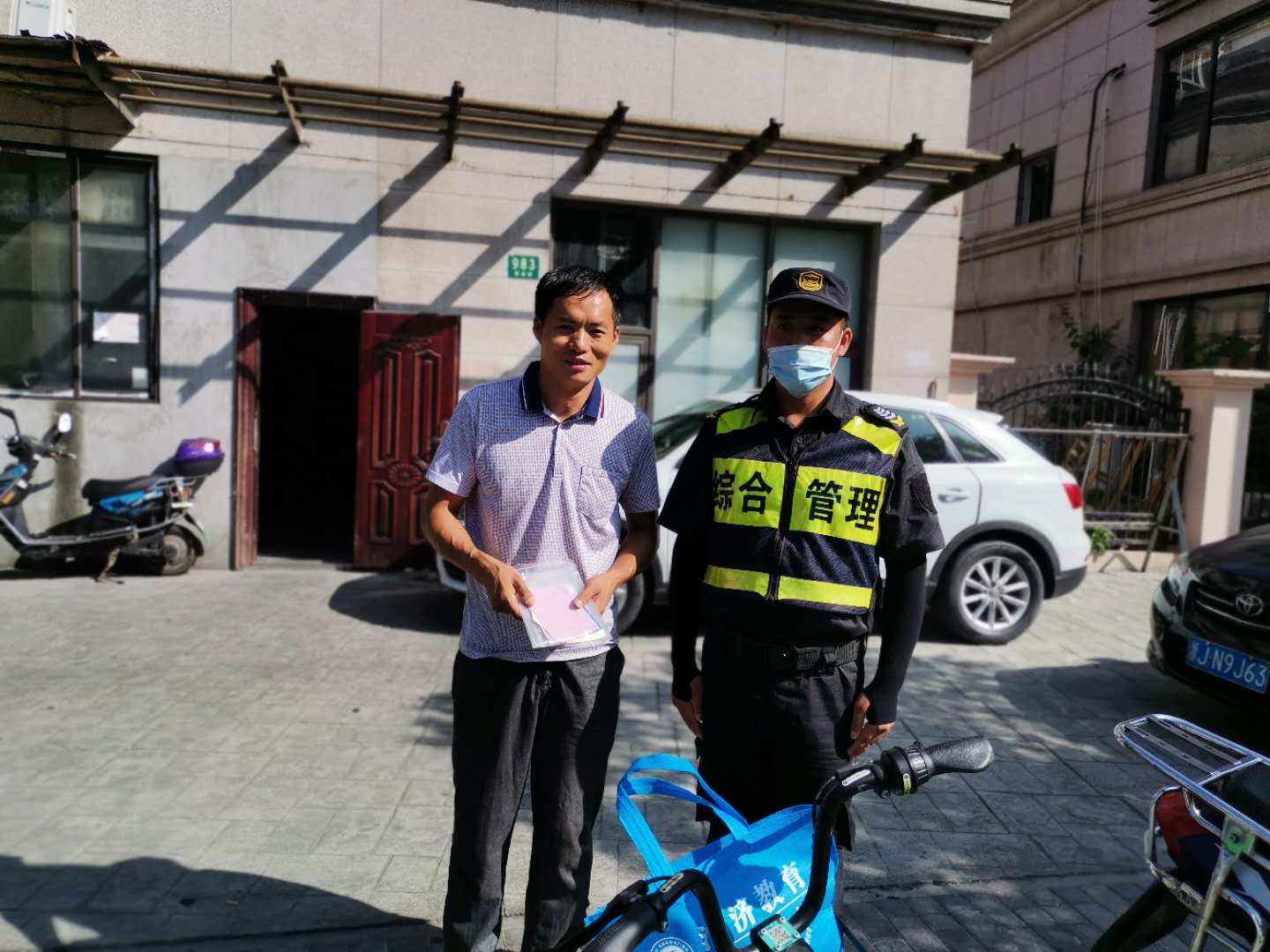 8月20日9:00左右,宗保公司駐三林城管輔助隊(duì)員李斌在板泉路980號門口整理共享單車時(shí),發(fā)現(xiàn)一輛車籃子里放著一個(gè)文件袋,里面裝有一份購車合同、身份證、銀行卡和房門鑰匙等物品。