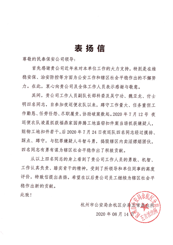 8月17日,浙江民泰駐五常輔警項目收到了五常派出所送來的一封表揚信,特別對項目副隊長邵科委等四名隊員提出表揚。