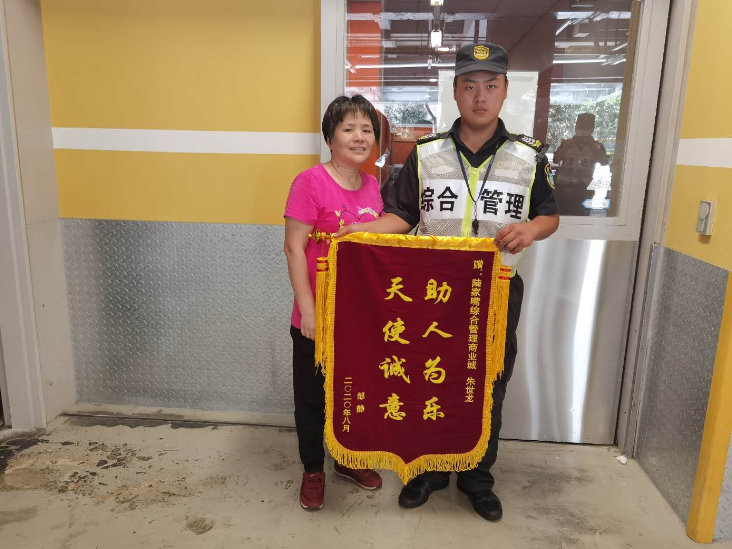 8月25日,一面繡有“助人為樂,天使誠意”的錦旗送到了宗保公司駐陸家嘴綜合管理項目朱世龍手中,并合影紀念。