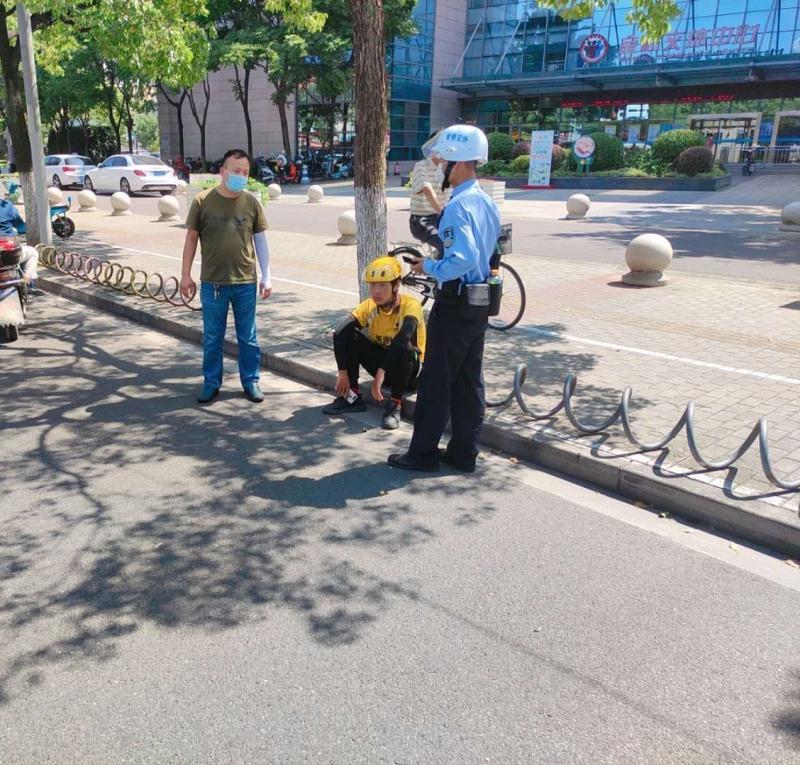 9月7日,金橋交通管理輔助隊員張繼、龔二龍、胡靜上崗期間遇到一起交通事故,三人攜手合力救助受傷外賣小哥。
