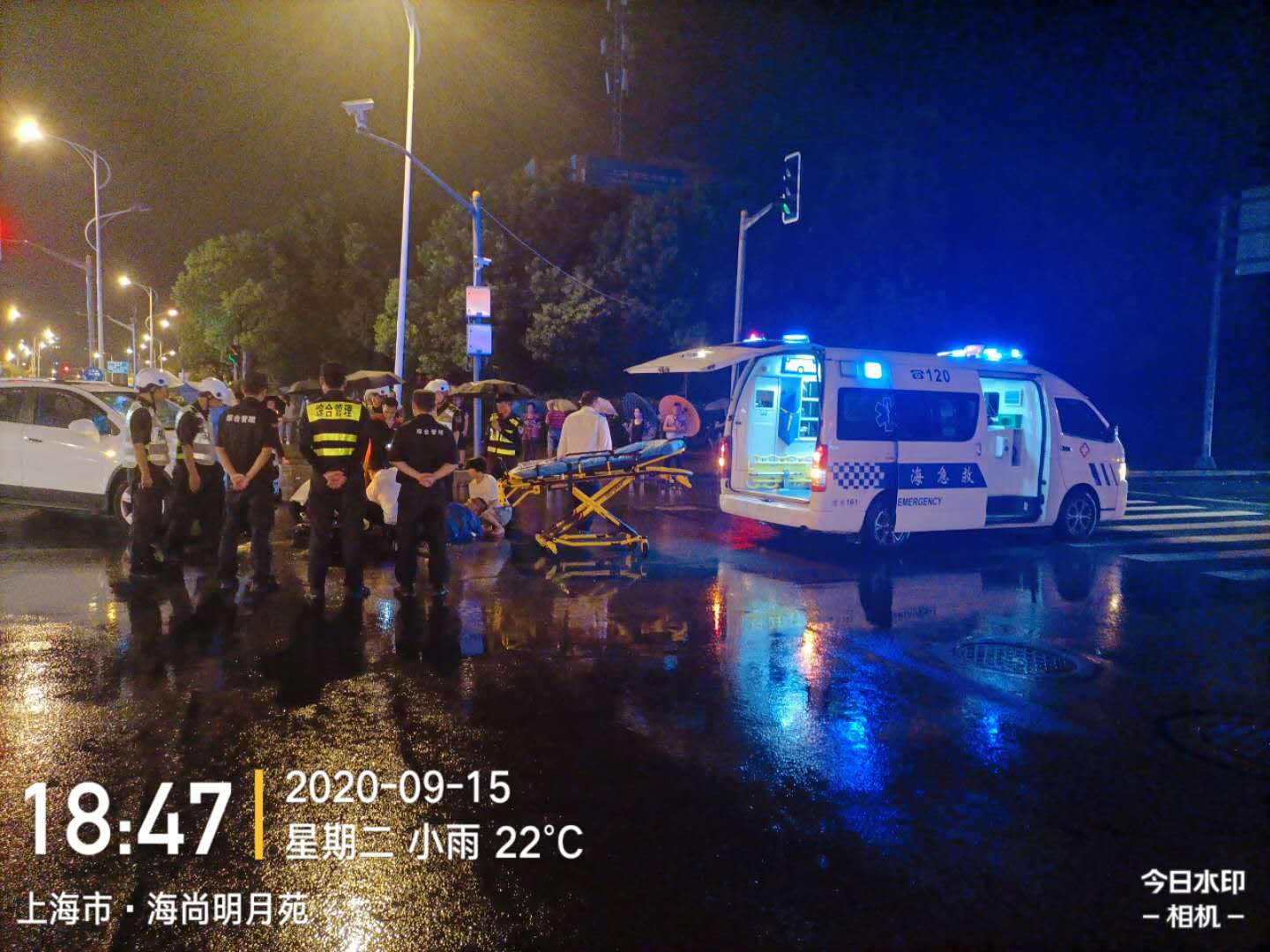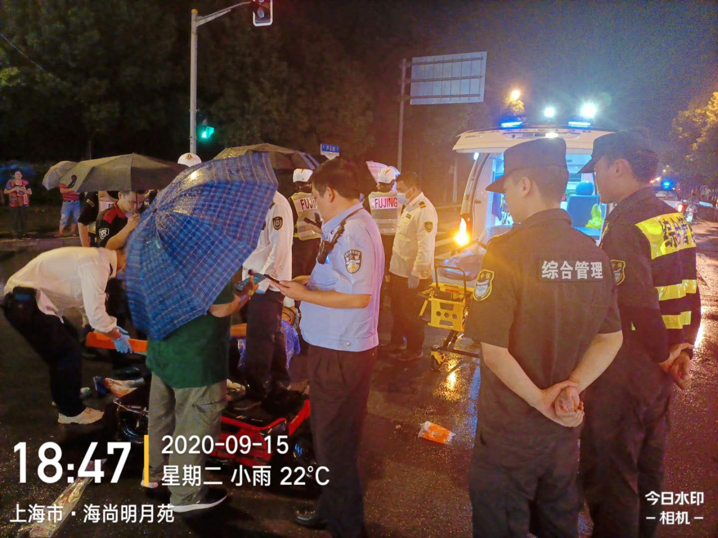 9月15日18:50,細雨綿綿,蘆潮港市容隊員侯亞林、劉勇輝冒雨巡邏至港輝路與蘆云路交叉口時,路口處剛發(fā)生一起交通事故,有人員受傷,現(xiàn)場圍觀群眾較多。