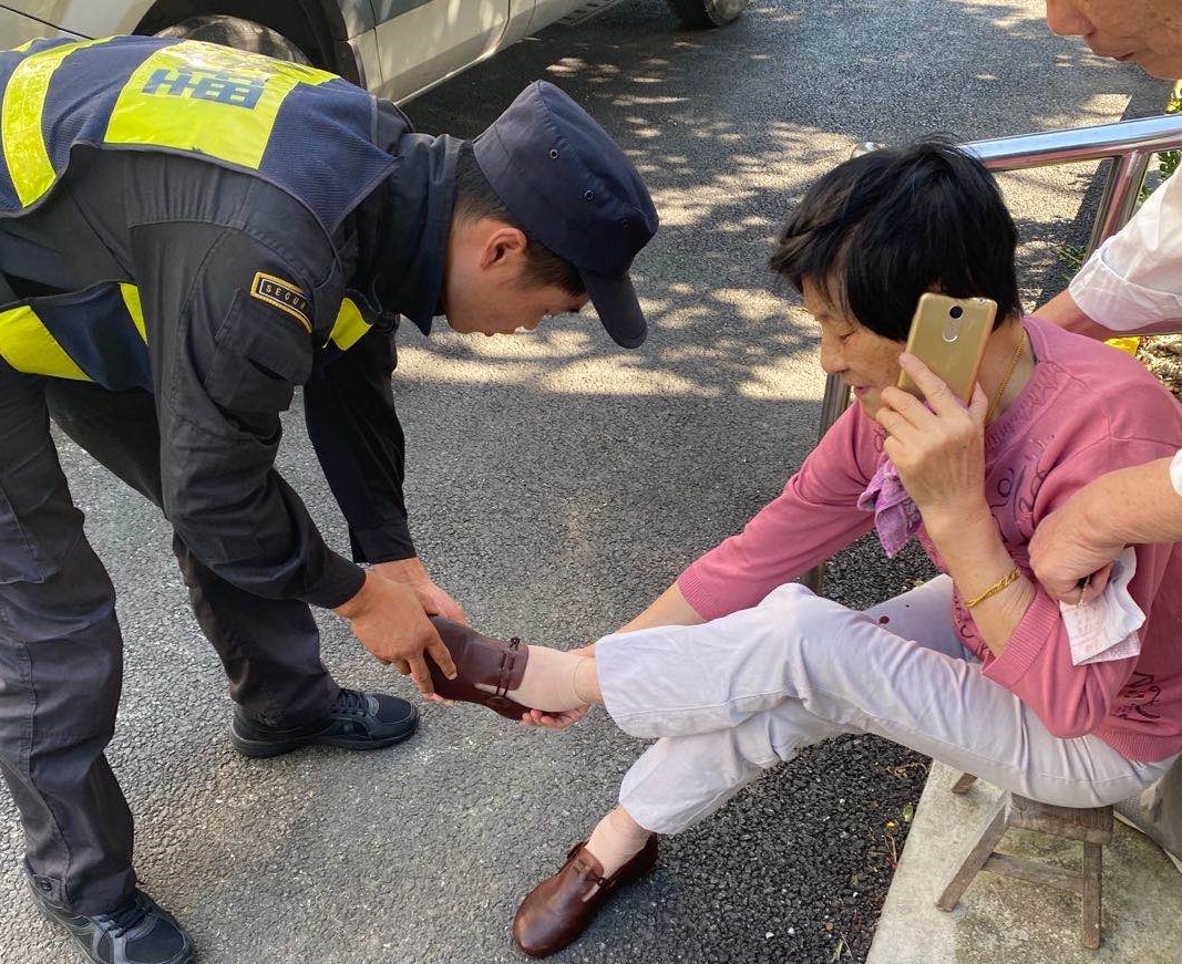 當(dāng)日9:30, 范金元和韓佳壯巡邏至靈巖南路海陽路路口時,發(fā)現(xiàn)一位老太太摔倒在地,便立即上前詢問是否需要幫助。