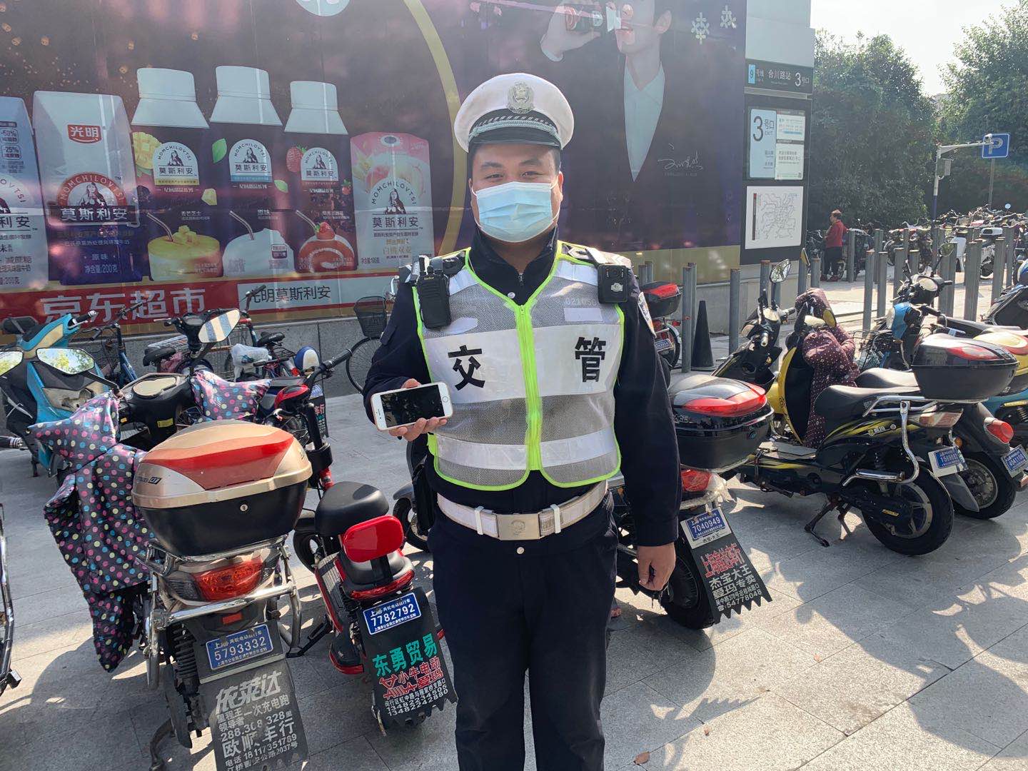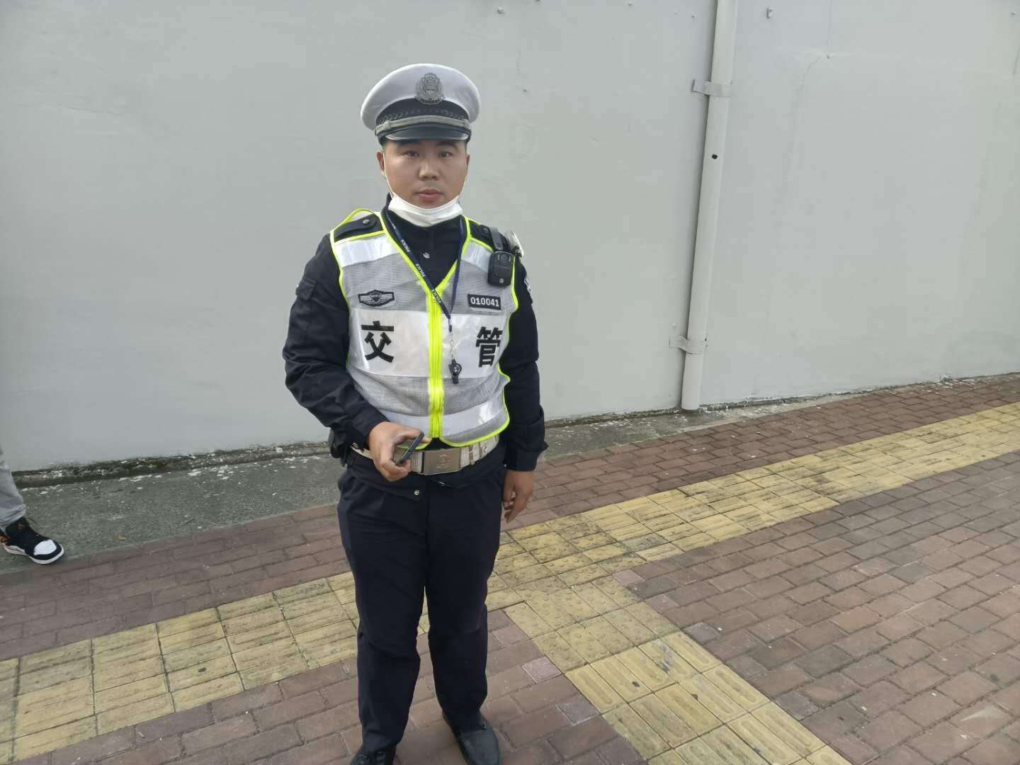 當(dāng)天16:30左右,付志勇在莘松西環(huán)路口值勤時,撿到一部手機(jī),因手機(jī)設(shè)有開機(jī)密碼,無法獲取失主的聯(lián)系電話,便在路口邊維持交通秩序,邊等待失主主動聯(lián)系。