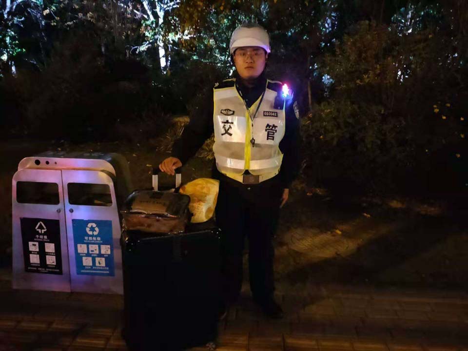 當(dāng)天19:25,宋金峰在滬青平七莘路路口東北角巡邏時撿到一個行李箱,考慮到失主丟了行李箱一定很著急,便在原地等待。