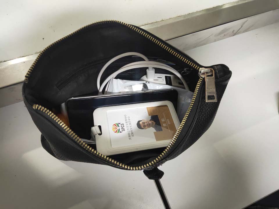 當(dāng)天19:37,王琦在出發(fā)層25號門前巡邏時,撿到一個手提包,便立即上報當(dāng)班領(lǐng)導(dǎo)。為了尋找失主的聯(lián)系方式,王琦打開執(zhí)法記錄儀錄像取證,經(jīng)清點包內(nèi)有手機(jī)、充電寶、幾張銀行卡等物品。