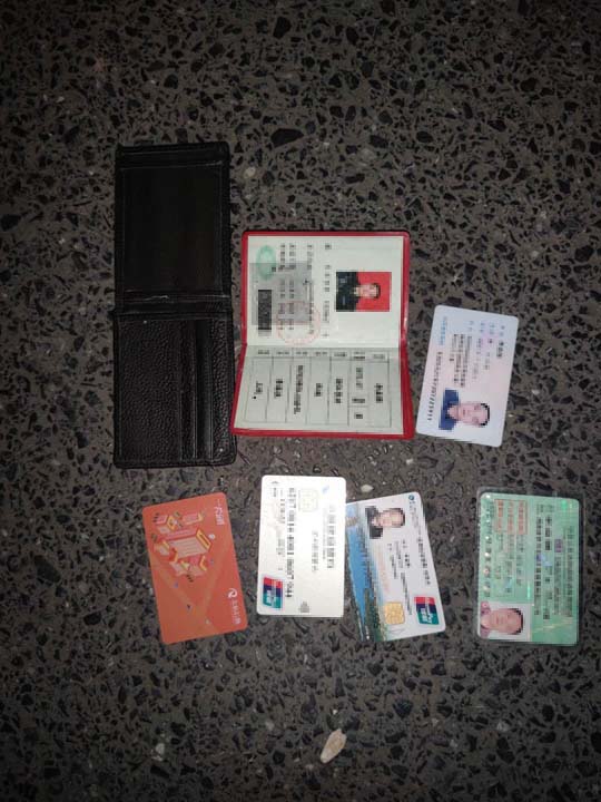 當(dāng)天18:30左右,楊有福巡邏至何母橋村委時,在非機(jī)動車道地上撿到一個錢包。為尋找失主信息,楊有福打開錢包清點,內(nèi)有身份證、駕駛證、市民卡、銀行卡和軍官證等物品。考慮到失主丟失證件一定很著急,便在原地等待。