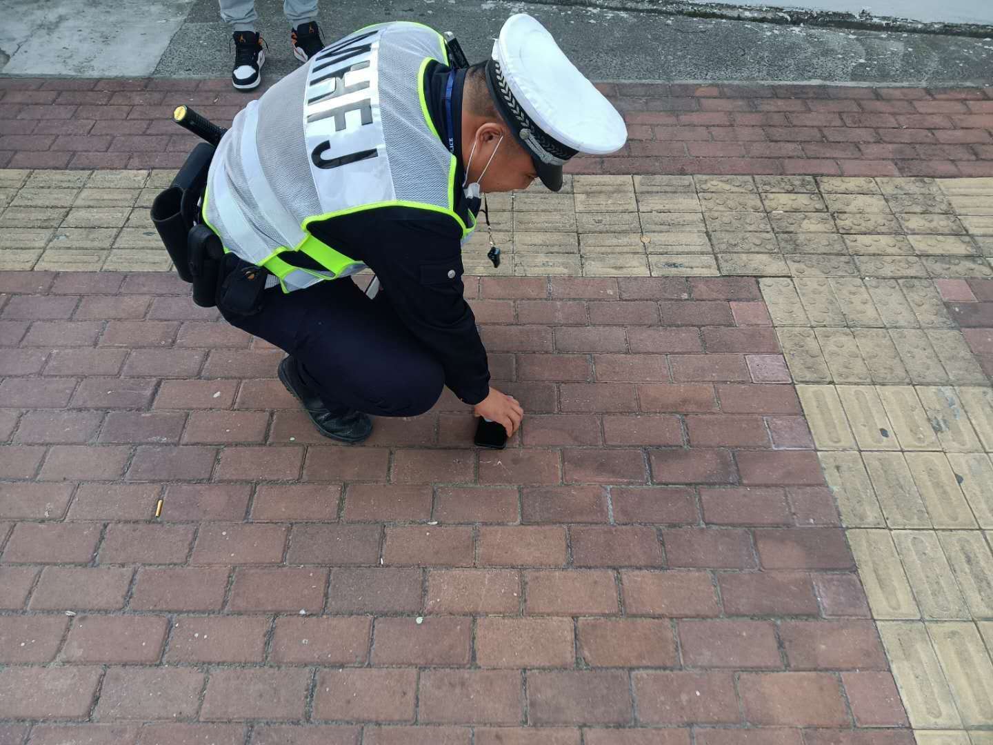 當(dāng)天7:10左右,李占明在北翟路華江路路口值勤時撿到一部手機(jī),便立即報告項目隊長,主動聯(lián)系失主過來取手機(jī)。隊長到達(dá)現(xiàn)場,拍照取證后和李占明一起在原地等待。
