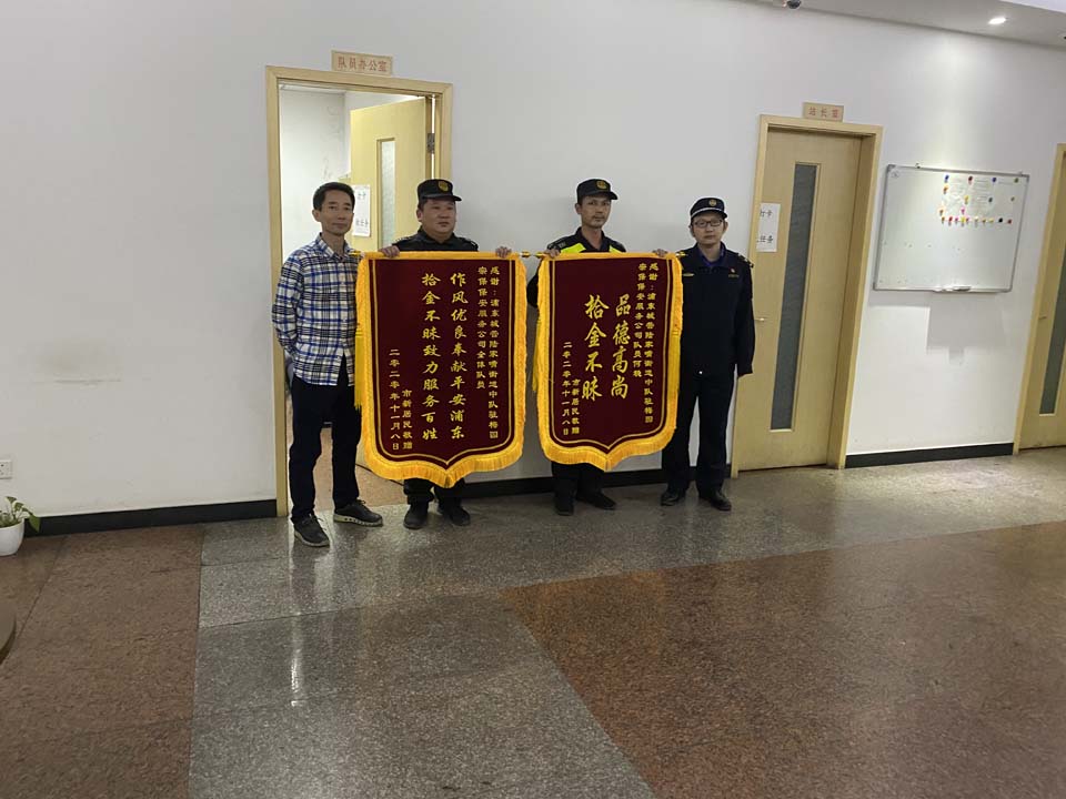 事后,馮先生特地來到陸家嘴街道城管中隊,將繡有“拾金不昧 品德高尚”“拾金不昧致力服務(wù)百姓 作風(fēng)優(yōu)良奉獻(xiàn)平安浦東”的兩面錦旗和一封熱情洋溢的感謝信送到何穩(wěn)手中,以表達(dá)謝意。
