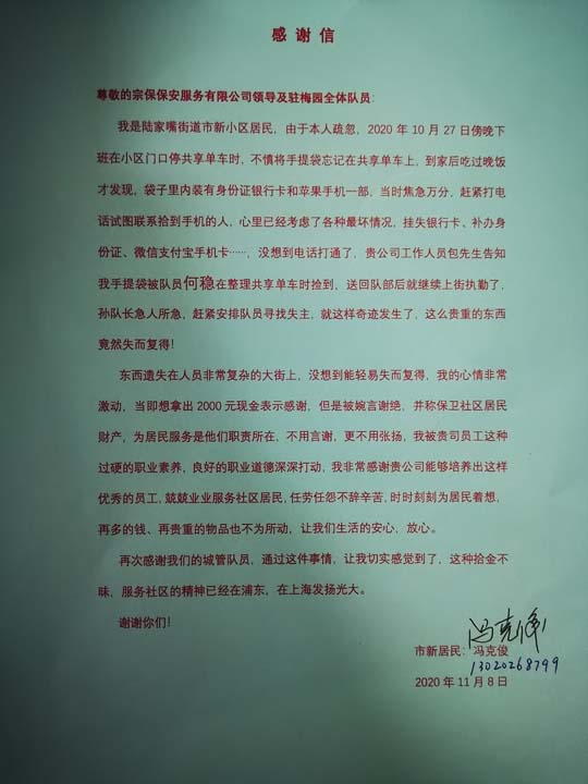 供稿人:李杰11月15日,宗保公司駐莘莊梅隴項目隊員付志勇?lián)斓绞謾C(jī)歸還失主,獲得感謝。