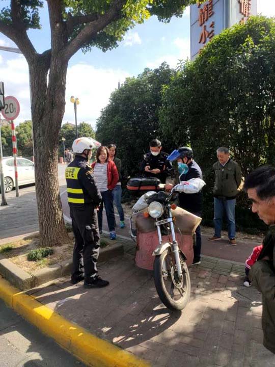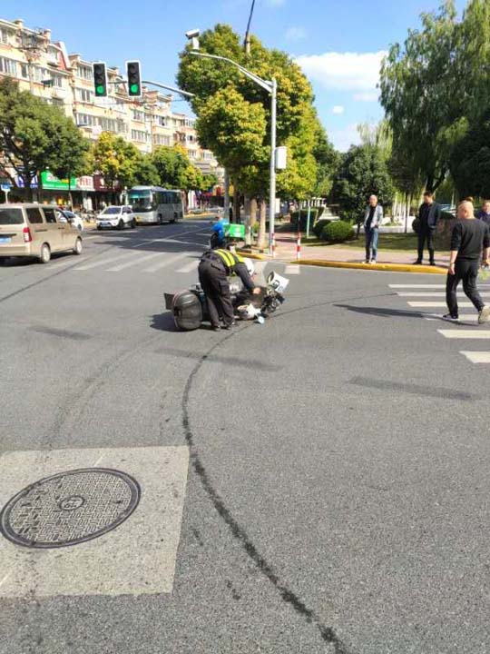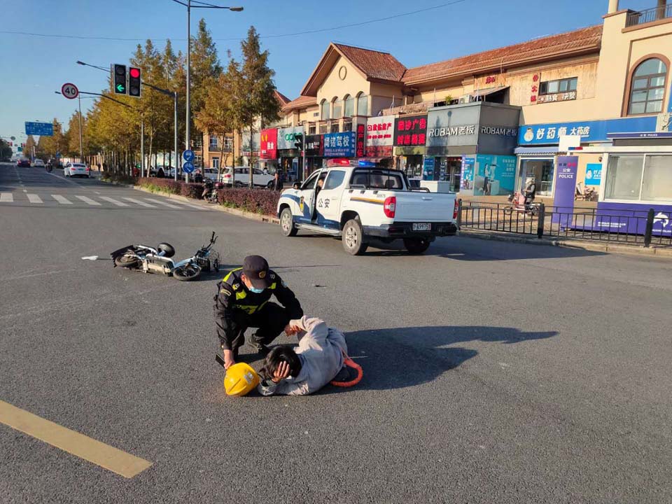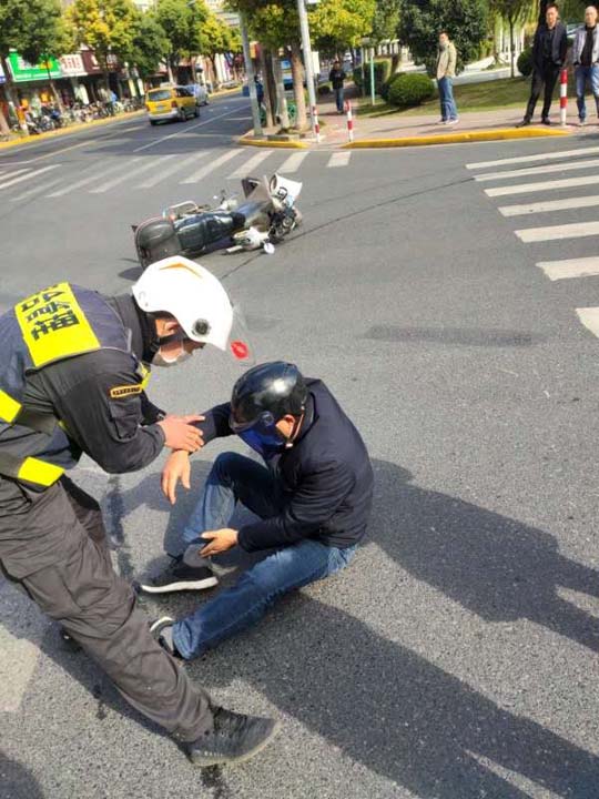 當(dāng)天11:30,黃盼強(qiáng)、石晉旭在和龍路大同路路口巡邏時,目睹一起交通事故:一輛小轎車和摩托車發(fā)生剮蹭,致使摩托車側(cè)翻,車主摔倒在地。
