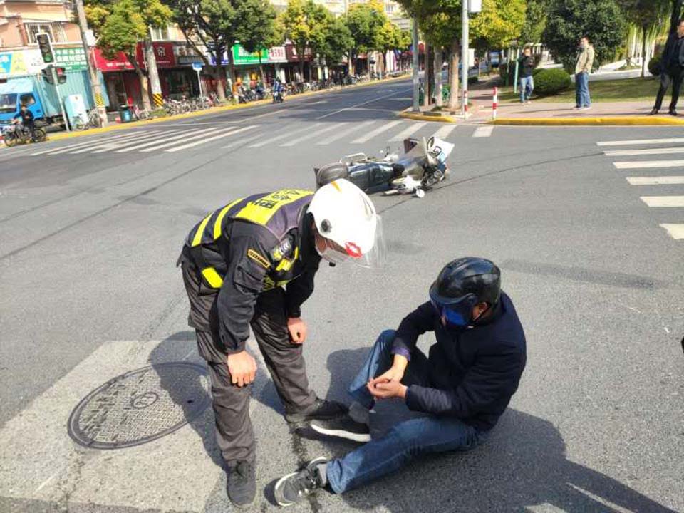 當(dāng)天7:30左右,劉忠杰、蔡仔俊、呂忙在仁建路與魚傲路路口巡邏時,忽然聽到“砰”的一聲響,循聲看到一輛轎車和電瓶車發(fā)生碰撞,機(jī)動車車主當(dāng)場逃逸,電瓶車車主摔倒在地。