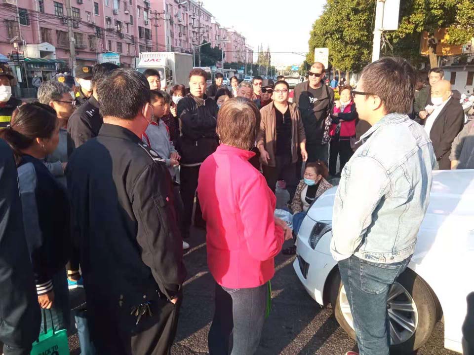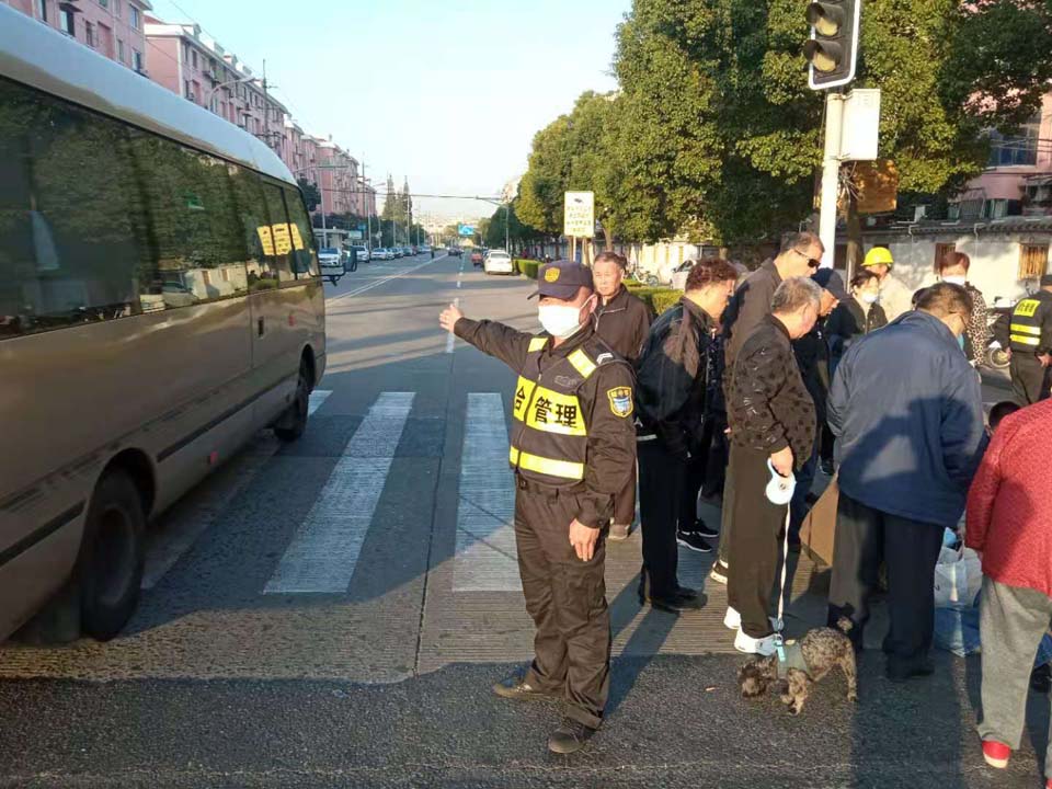 11月10日,宗保公司駐高行市容項目隊員王偉偉積極維護(hù)車禍現(xiàn)場交通秩序。
