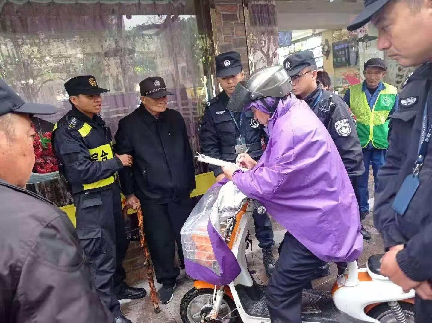 當(dāng)天8:10,余威、譚吉城在邱山大街巡邏時,發(fā)現(xiàn)一位老人坐在地上,身體不停地發(fā)抖,便立即上前詢問。老人說自己腿腳突然無力站不起來,沒有辦法回去了。