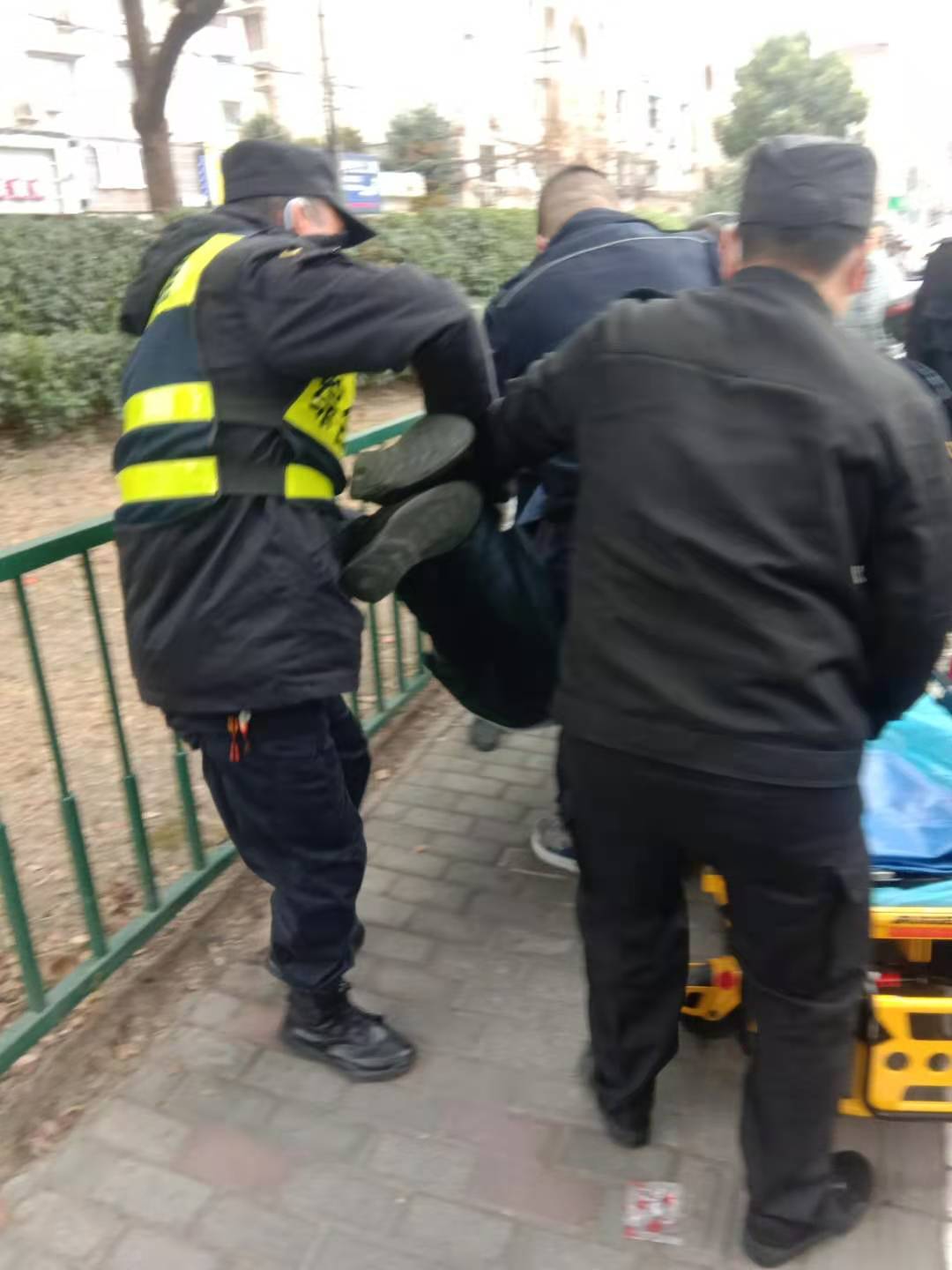 在等救護(hù)車期間,隊員一邊疏散圍觀群眾,一邊做好老人看護(hù)。幾分鐘后,急救車趕到現(xiàn)場,隊員協(xié)助救護(hù)人員將老人抬上救護(hù)車,送往醫(yī)院救治。