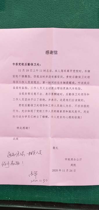 11月24日,一封感謝信送到了宗保公司駐市委黨校項目隊員的手中,學(xué)員周凱感謝張?zhí)規(guī)椭涓鼡Q輪胎。