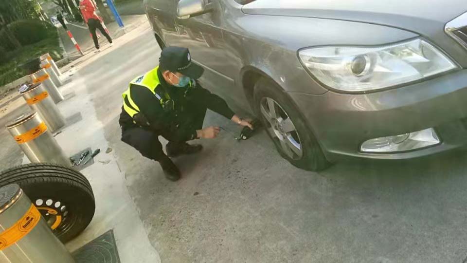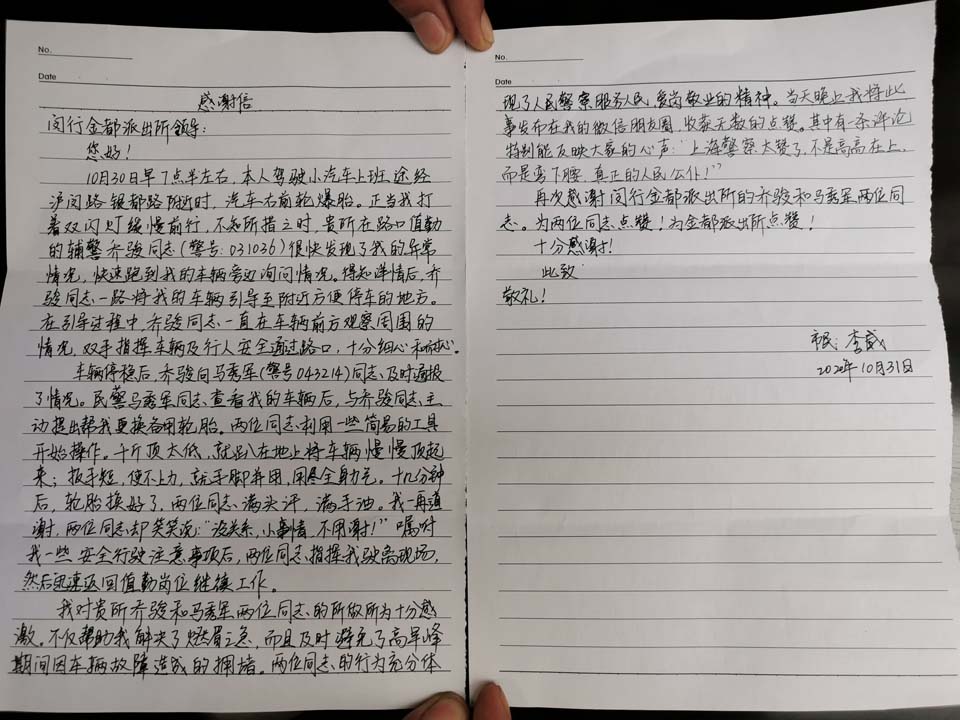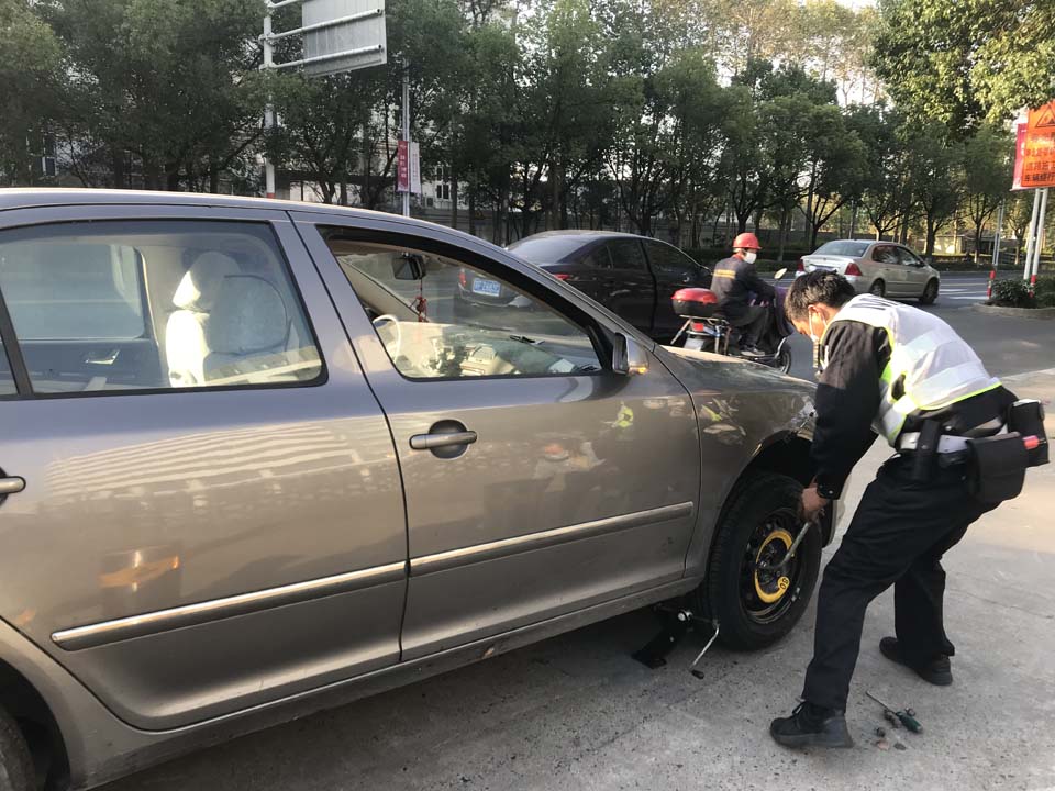 10月30日7:30,李女士駕駛小型汽車行駛至滬閔銀都路口時(shí),車輛右前輪突然爆胎,在路中間打著雙閃緩慢行駛。路口當(dāng)值民警馬秀軍和輔警喬駿發(fā)現(xiàn)后,立即上前詢問(wèn),了解情況后及時(shí)將車輛引導(dǎo)至不影響交通的分局南大門處。