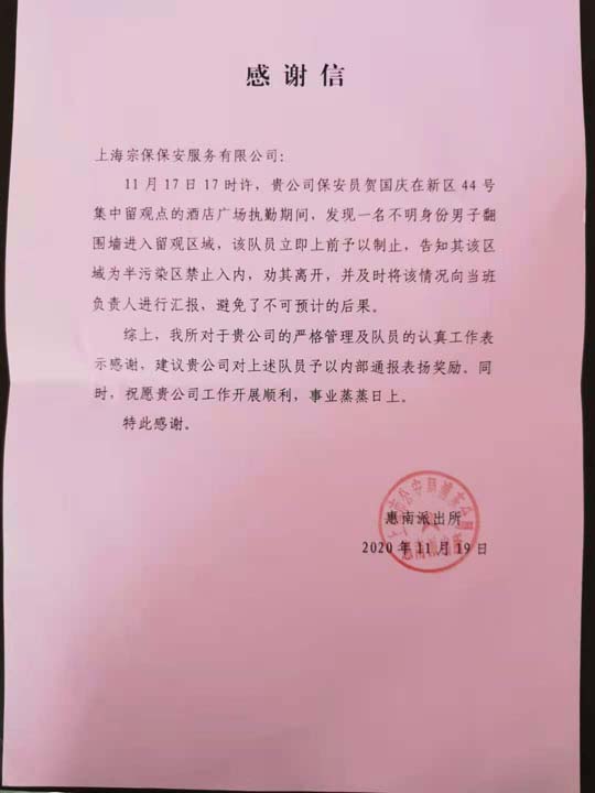 11月19日,浦東新區(qū)公安分局惠南派出所副所長殷昌建將一封感謝信送到公司駐惠南區(qū)域隊(duì)員賀國慶手中,對(duì)其及時(shí)制止一名男子企圖進(jìn)入隔離區(qū)的行為提出表揚(yáng)。